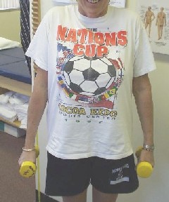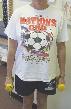 2. Hold a dumbbell in involved hand as shown (Fig. 1).(手持啞鈴, 如圖 1 )